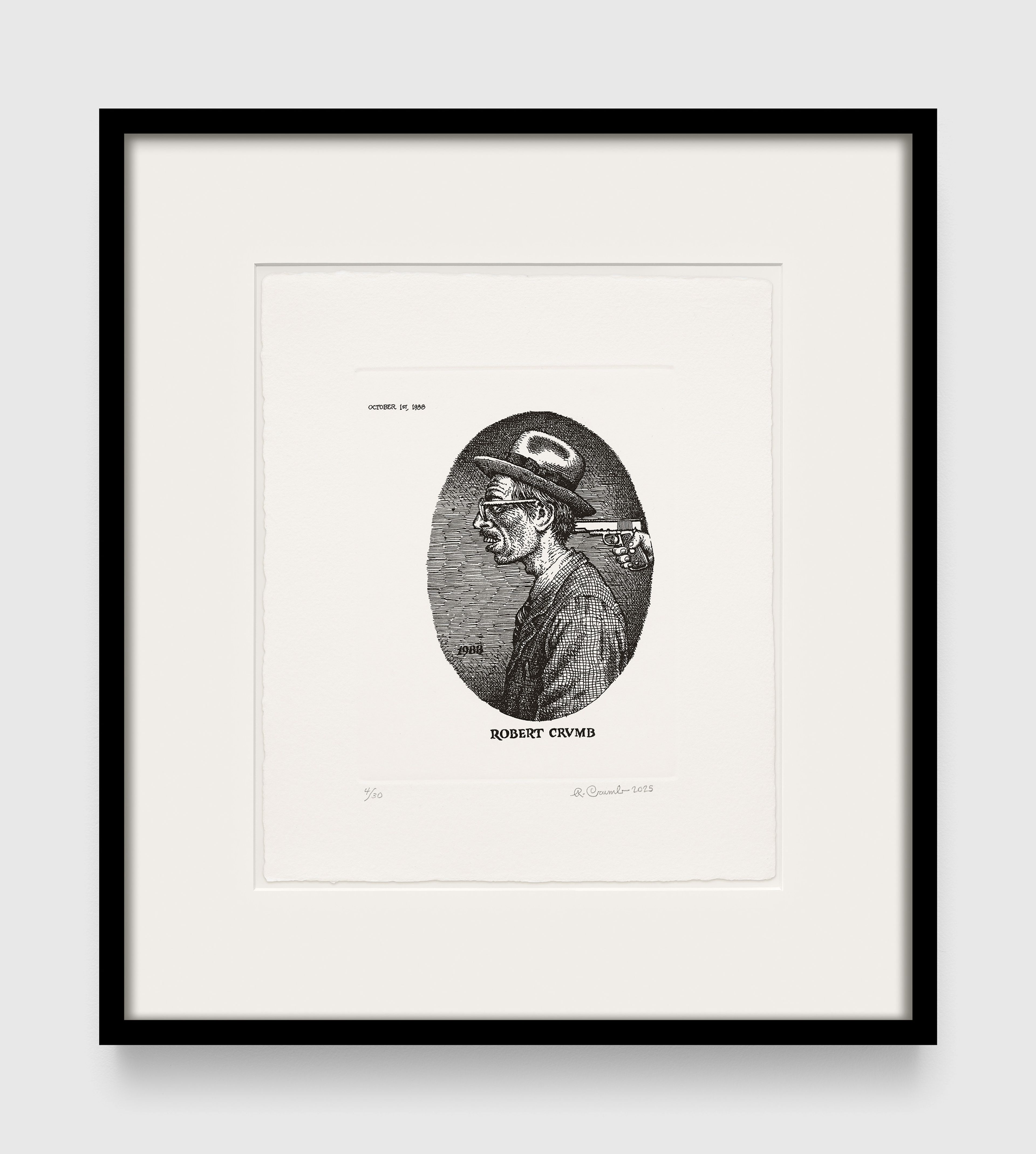 R. Crumb, Self Portrait (Gun), 2025, Etching on paper, 13 x 11 inches